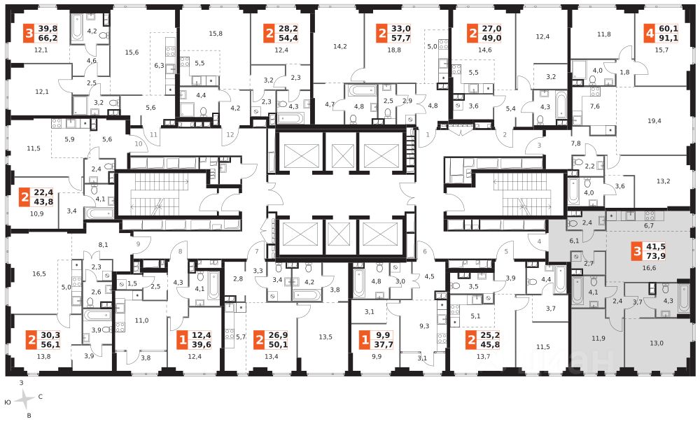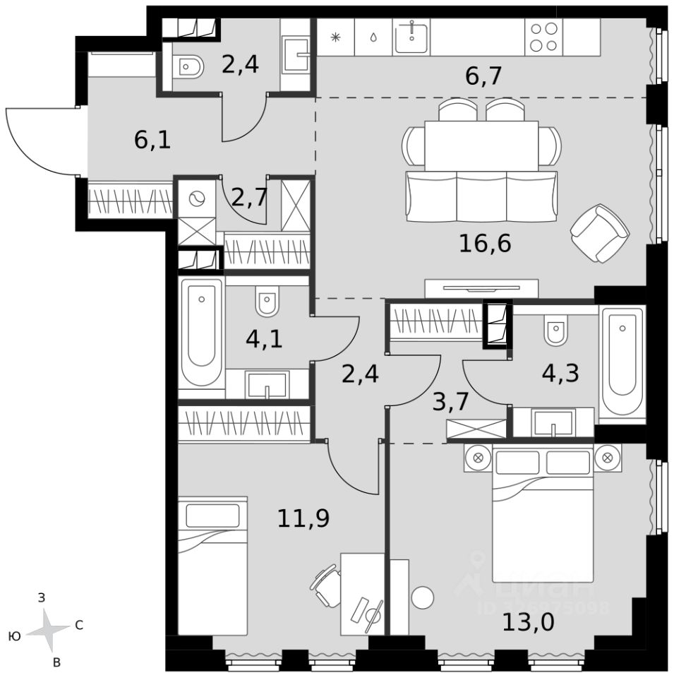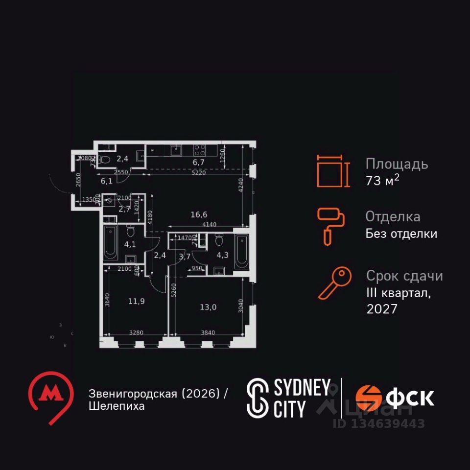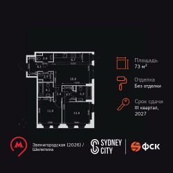 Продаётся 3-к квартира номер 454 общей площадью 73.9 кв.м. на 2-м этаже 42 этажного здания. Без отделки. Цена с учётом скидки.