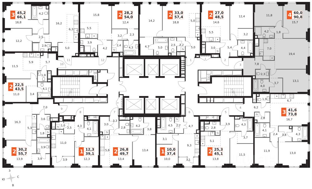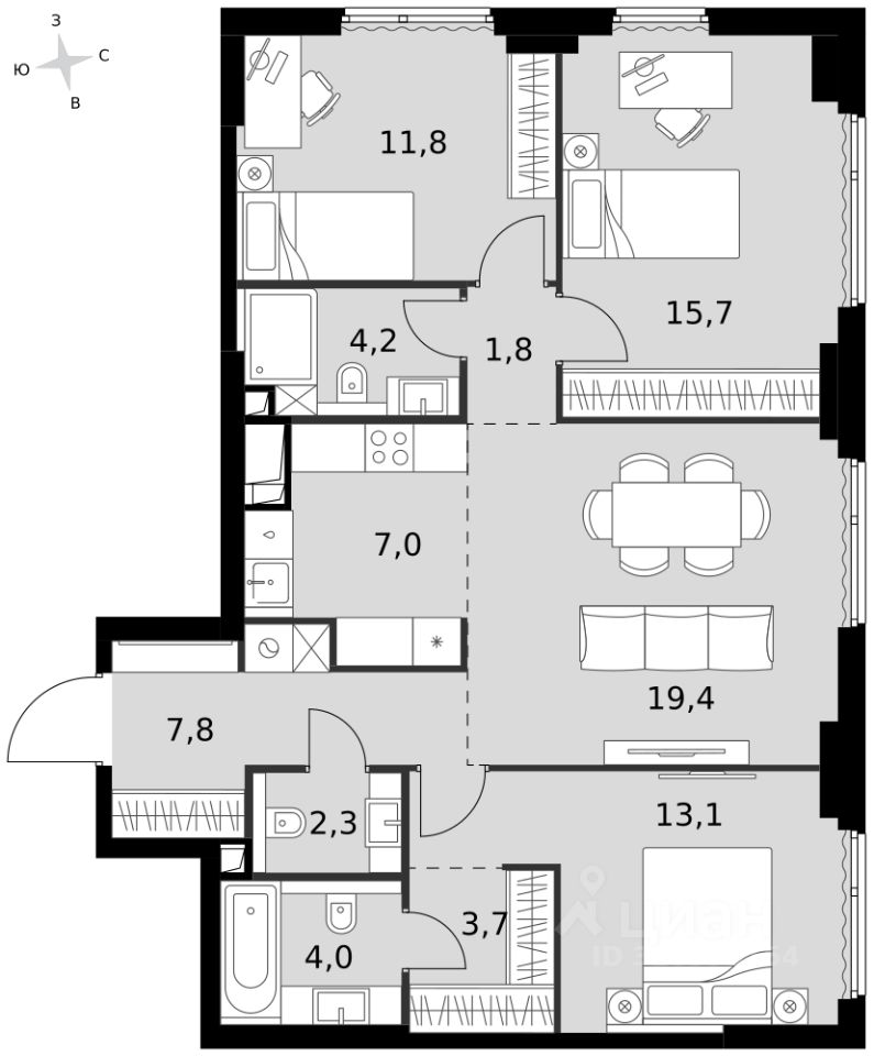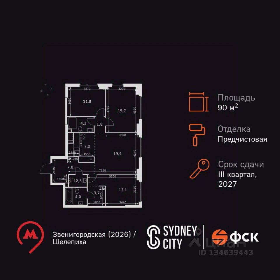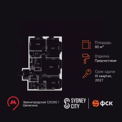 Продаётся 4-к квартира номер 609 общей площадью 90.8 кв.м. на 15-м этаже 42 этажного здания. Отделка Whitebox. Цена с учётом скидки.