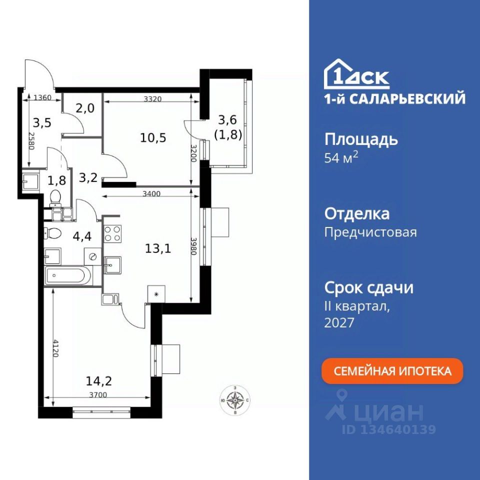Продаётся 2-к квартира номер 110 общей площадью 54.5 кв.м. на 11-м этаже 25 этажного здания. Предчистовая отделка. Цена с учётом скидки.