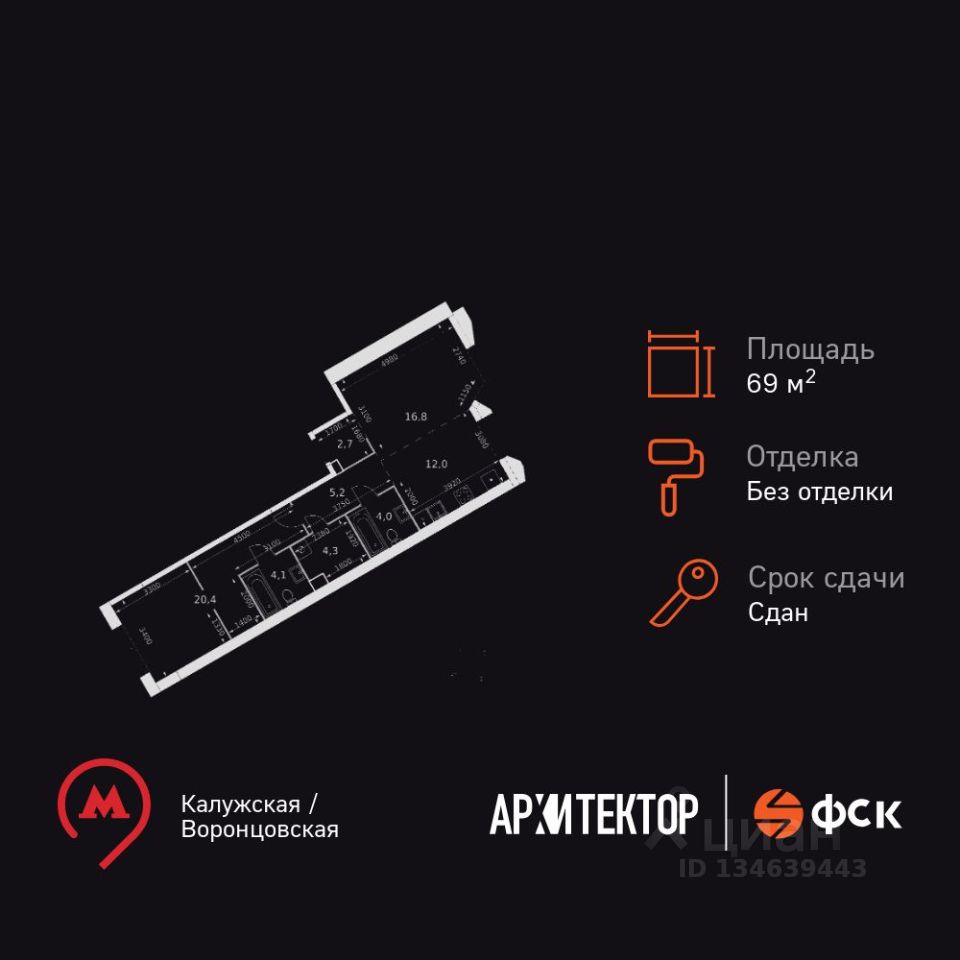 Продаётся 2-к квартира номер 1265 общей площадью 69.5 кв.м. на 46-м этаже 47 этажного здания. Без отделки. Цена с учётом скидки.