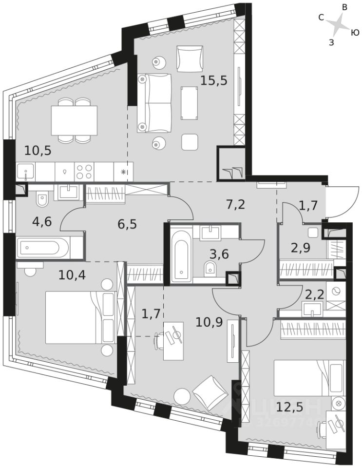 - Мастер-зона с санузлом и гардеробной. Всё для вашего комфорта и удобства, включая личный санузел и гардероб.