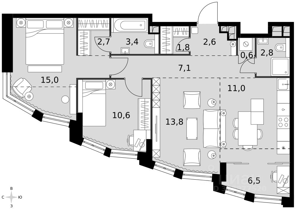 - Мастер-зона с санузлом и гардеробной. Всё для вашего комфорта и удобства, включая личный санузел и гардероб.