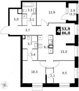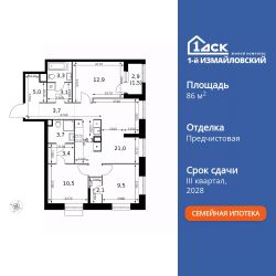 Продаётся 4-к квартира номер 525 общей площадью 86 кв.м. на 9-м этаже 32 этажного здания. Отделка Whitebox.