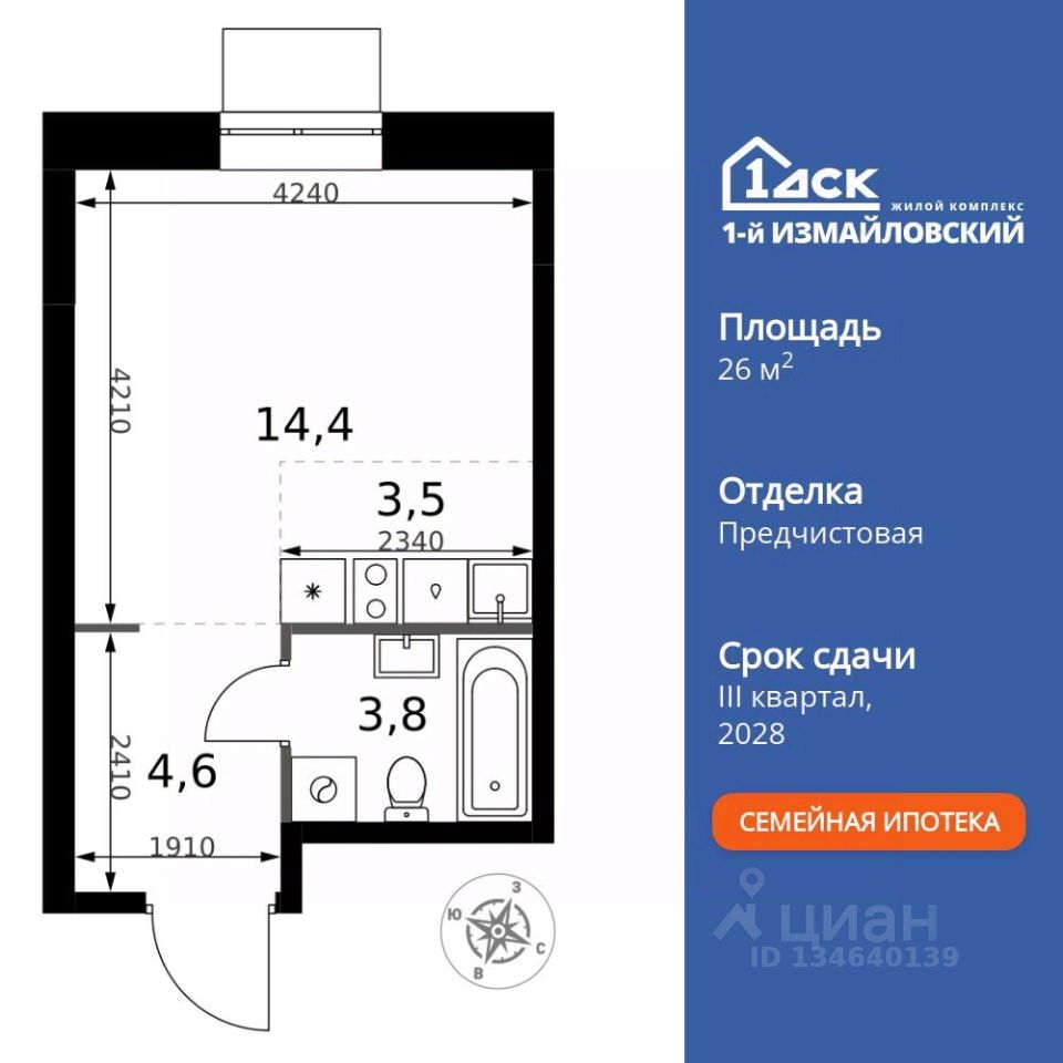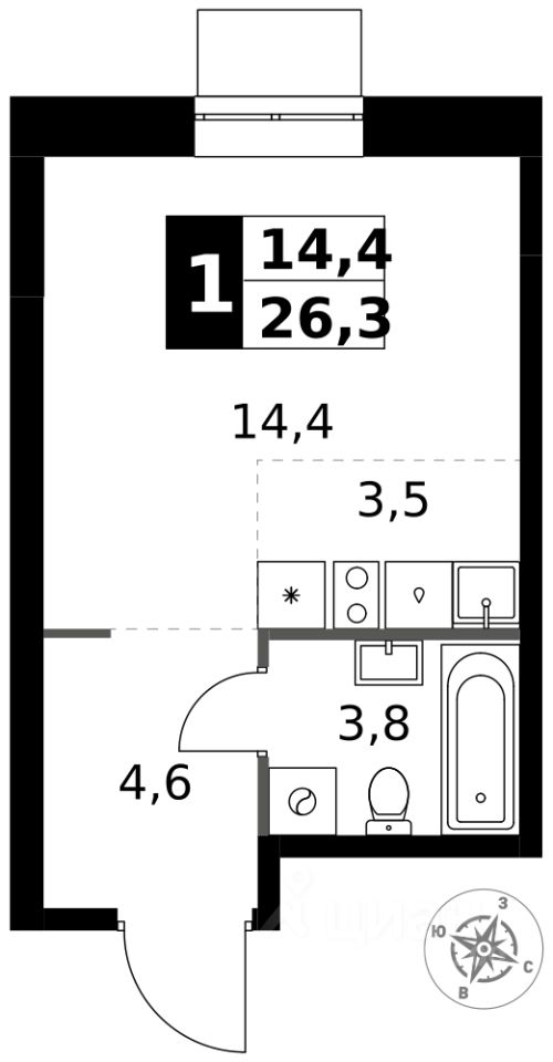 Продаётся квартира-студия номер 537 общей площадью 26.3 кв.м. на 9-м этаже 32 этажного здания. Отделка Whitebox.