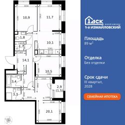 Продаётся 4-к квартира номер 859 общей площадью 89.1 кв.м. на 31-м этаже 32 этажного здания. Без отделки.