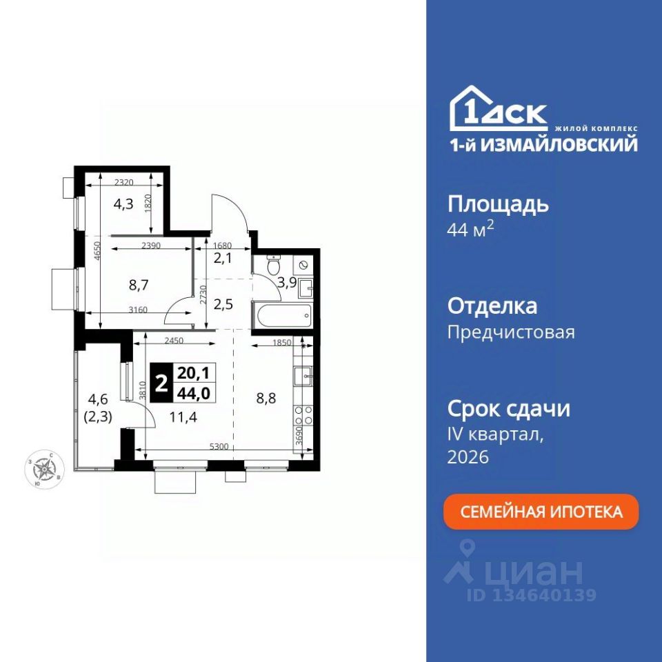 Продаётся 2-к квартира номер 563 общей площадью 44 кв.м. на 4-м этаже 15 этажного здания. Предчистовая отделка. Цена с учётом скидки.