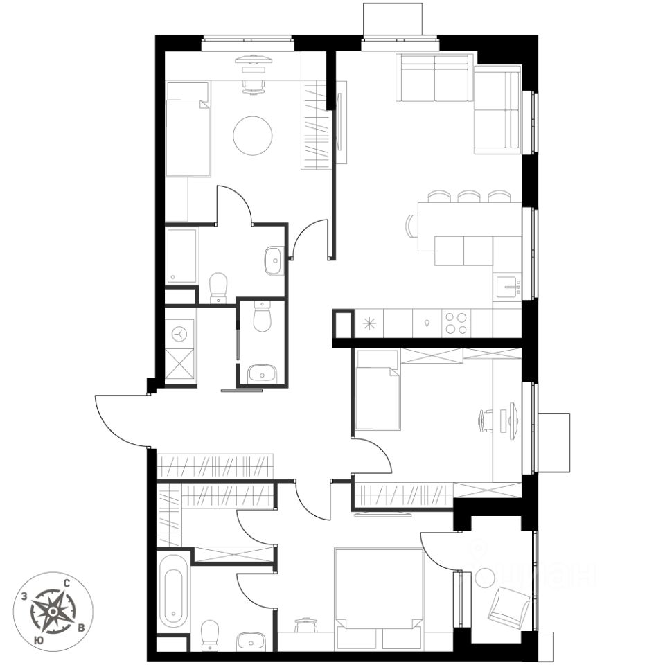 - Мастер-зона с санузлом и гардеробной. Всё для вашего комфорта и удобства, включая личный санузел и гардероб.