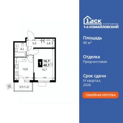 Продаётся 1-к квартира номер 327 общей площадью 40.7 кв.м. на 6-м этаже 12 этажного здания. Предчистовая отделка. Цена с учётом скидки.