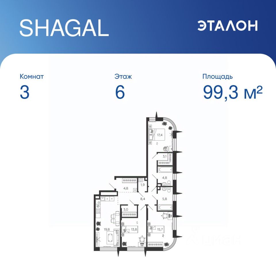 Общая площадь квартиры — 99.3 кв. м, этаж 6 из 15.
