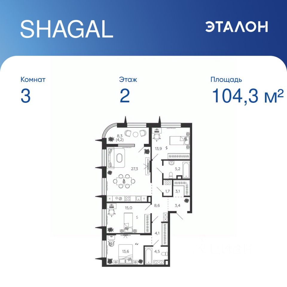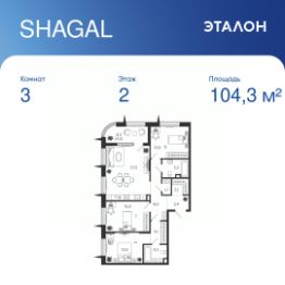 Общая площадь квартиры — 104.3 кв. м, этаж 2 из 9.