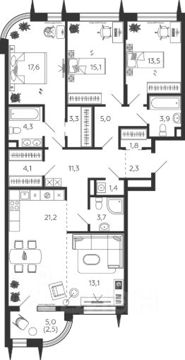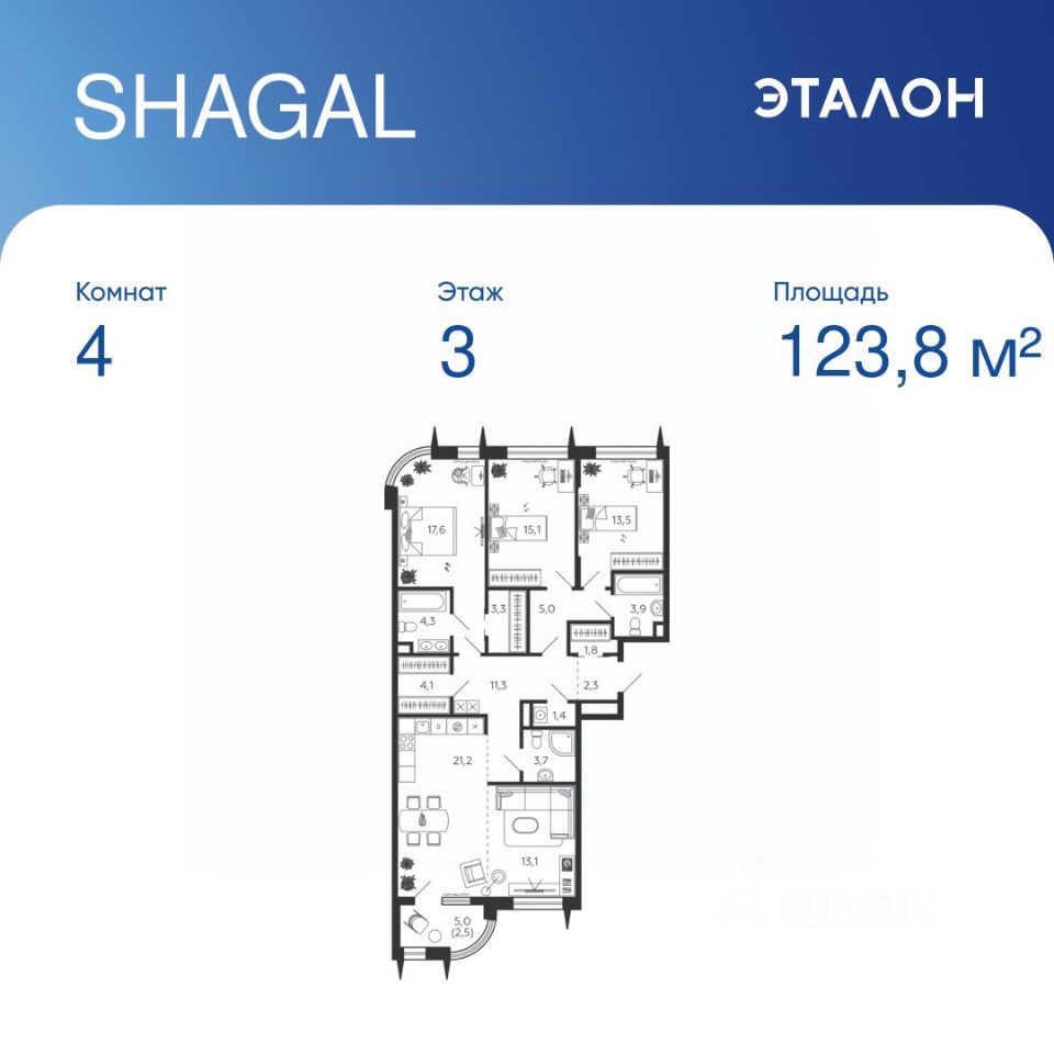 Общая площадь квартиры — 123.8 кв. м, этаж 3 из 15.