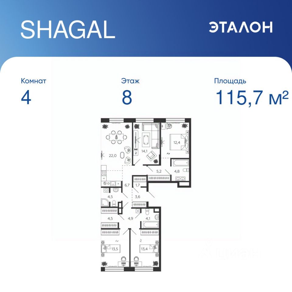 Общая площадь квартиры — 115.7 кв. м, этаж 8 из 9.