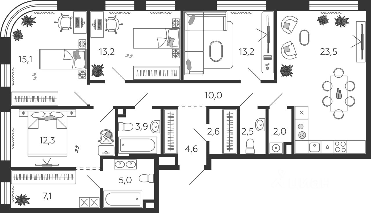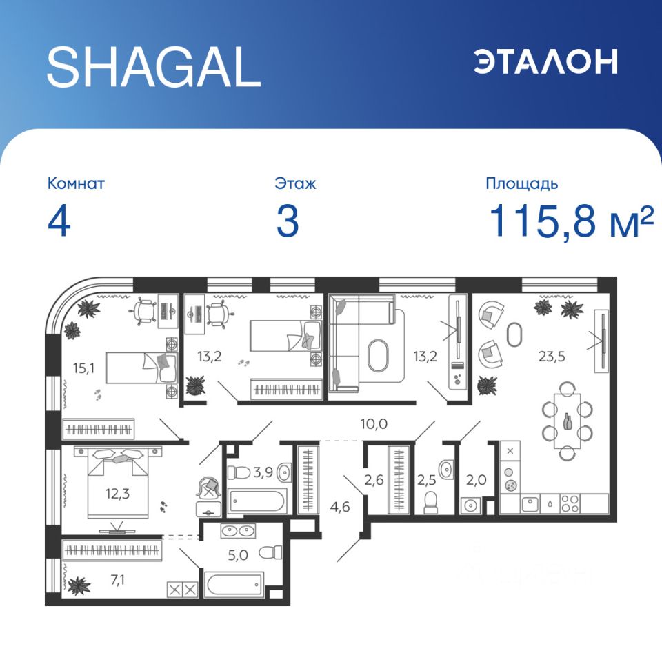 Общая площадь квартиры — 115.8 кв. м, этаж 3 из 7.