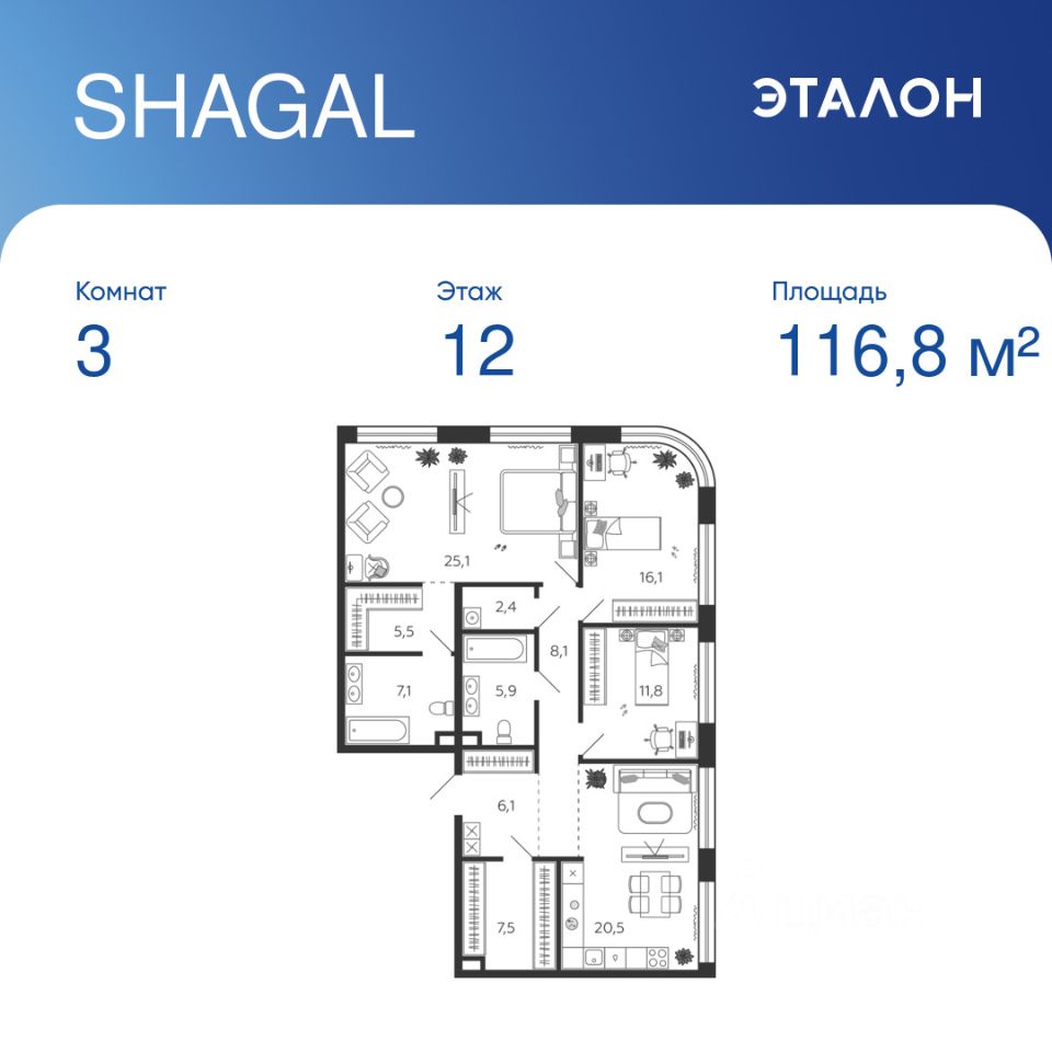 Общая площадь квартиры — 116.8 кв. м, этаж 12 из 17.