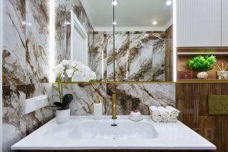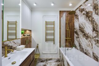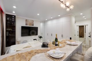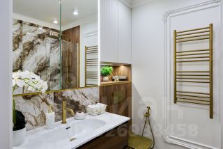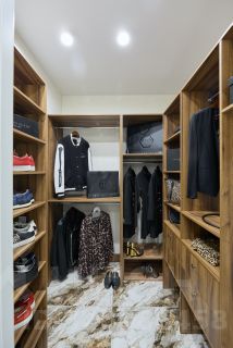 Квартира спроектирована с большим количество мест для хранения ( всё на заказ в едином стиле из качественного немецкого МДФ с механизмами доводки). Имеется просторная гардеробная и шикарная ванная с бронзовой сантехникой.