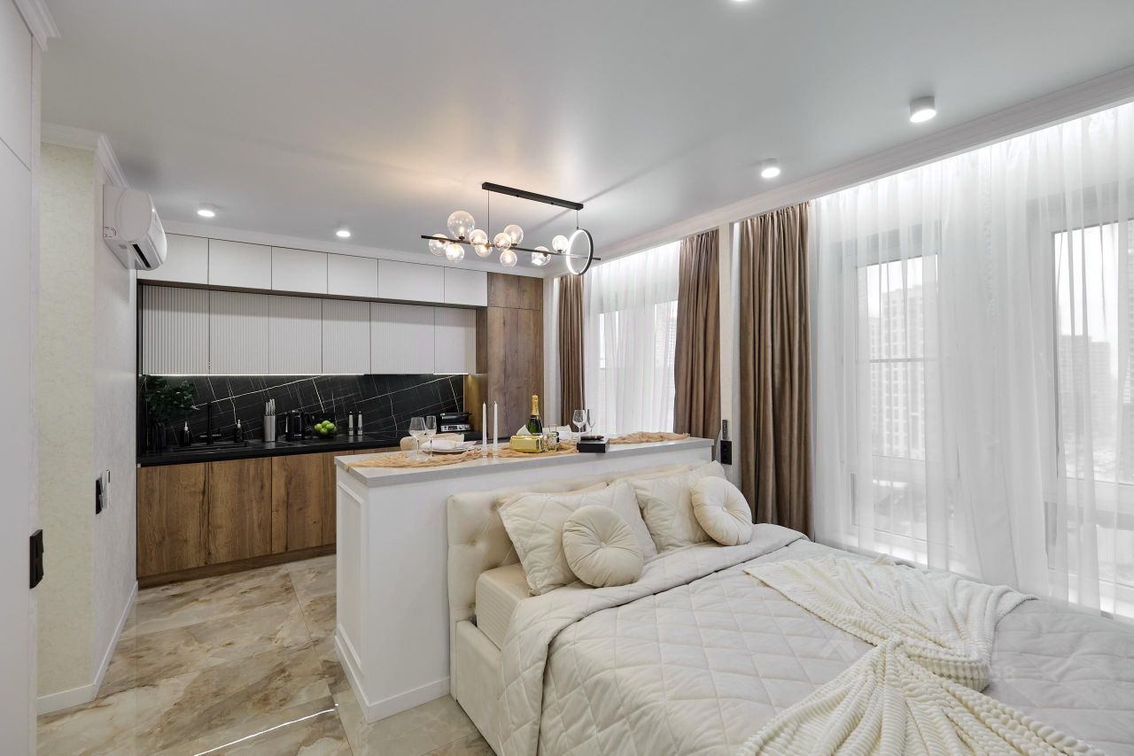 Установлены кондиционер и электрический карниз с пультами управления для штор и подсветки. Из окон открывается красивый вид на город. Ремонт делался для себя, выбирая лучшее.