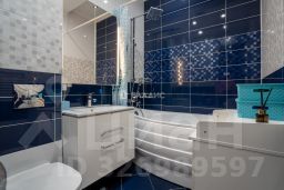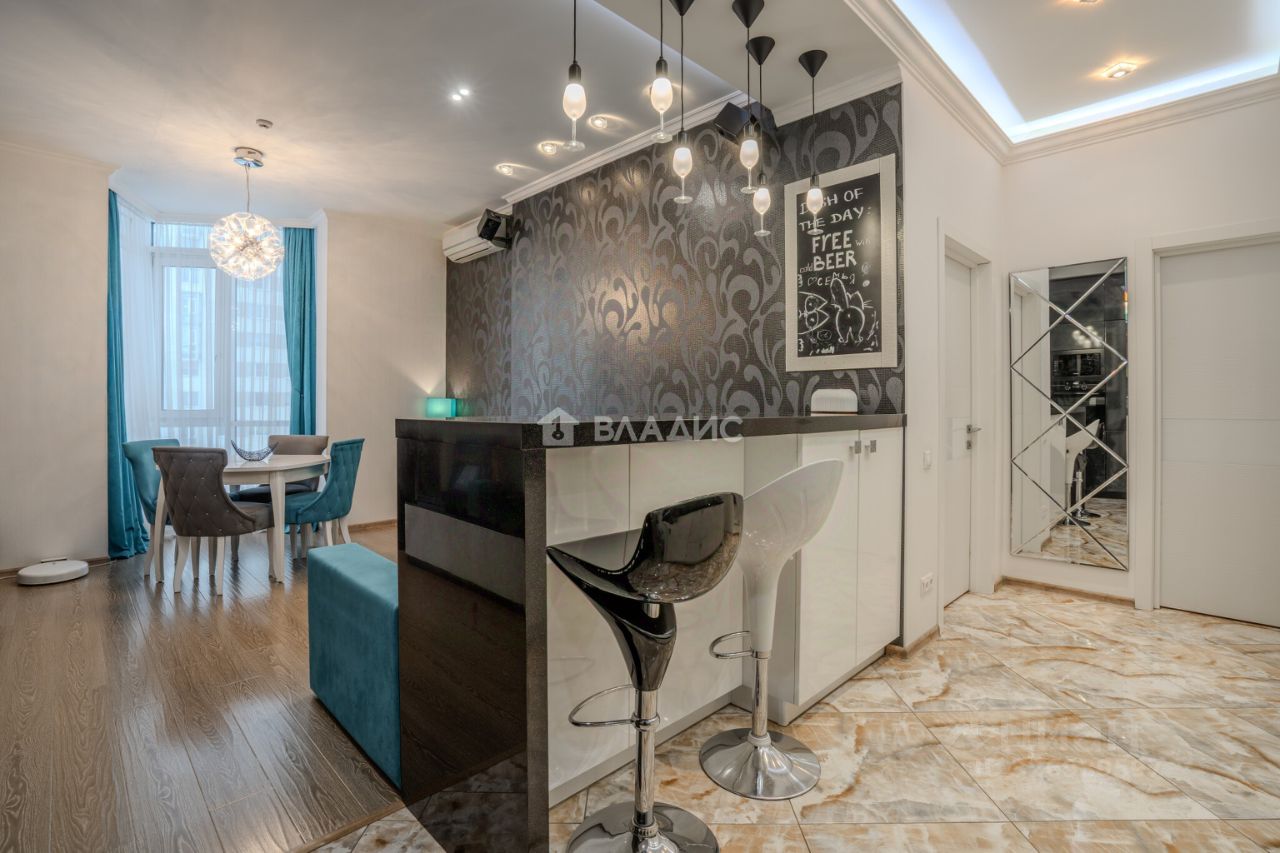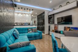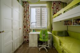 Дизайнерский проект позволил оптимизировать площадь в сочетании с функциональным зонированием: кухня со встроенной бытовой техникой (посудомоечная машина, духовой шкаф с функцией свч, холодильник, варочная панель, стиральная машина) и барной стойкой, примыкающей к кухне лаунж зоне с эркером и окном в пол, местом под обеденную группу, диван, модуль для ТВ и хранения вещей, изолированная спальня с увеличенным угловым окном и вместительным гардеробом; вторая изолированная комната с местами для сна/отдыха, рабочего стола и шкафов для хранения вещей, совмещённый санузел с ванной и местом для сушки белья, холл со встроенными шкафом-купе.