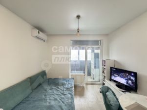 Студия включает в себя ремонт, новая мебель, полноценная кухня, балкон с панорамными окнами с видом на город, стиральная машина, кондиционер, холодильник.