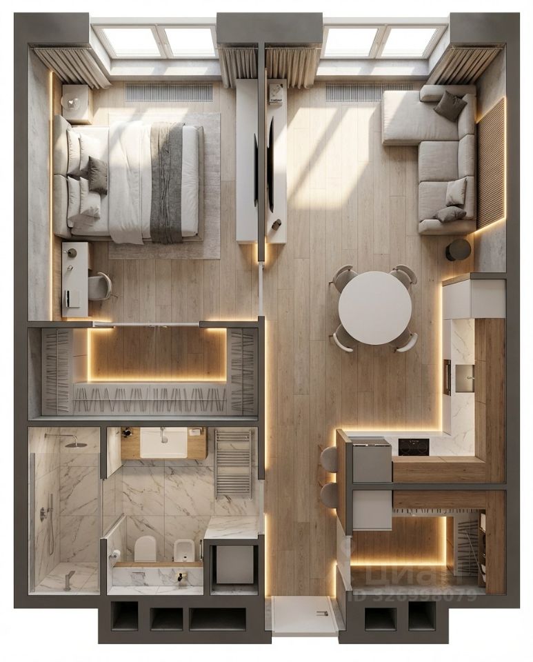 Общая площадь квартиры — 57 кв. м, из которых 18 кв. м выделены под жилое пространство, а кухня занимает 24 кв. м. Квартира находится на 4 этаже семиэтажного дома 2023 года постройки. Высота потолков составляет 3,1 метра, что создает ощущение простора и света.