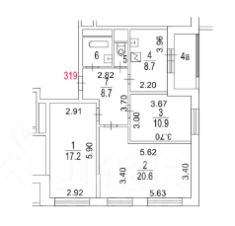 Общая площадь 70,6 квадратных метров. Комнаты 11, 21 и 17 кв.м. Кухня 8,7 кв. м., просторная лоджия 4 кв. м с выходом из кухни. Санузел раздельный, большой холл размером 8,7 кв. метров. Чистый просторный подъезд, консьерж.