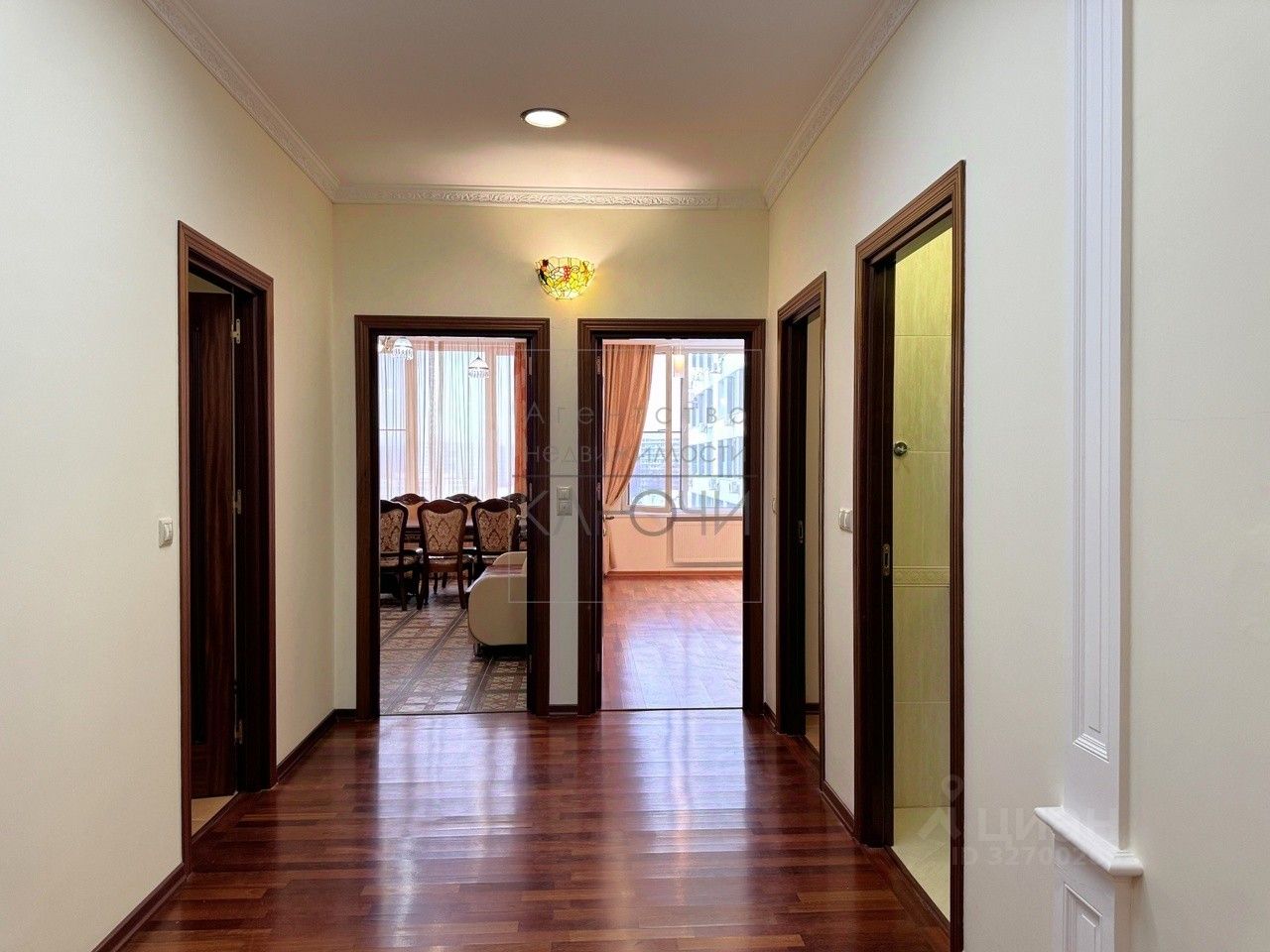 Пространство квартиры выстроено по классической схеме: три изолированные комнаты правильной формы (площадь каждой от 20 м) позволяют рационально организовать быт. Просторная кухнястоловая площадью 21 кв м. Высокие трёхметровые потолки усиливают ощущение простора, а двусторонняя ориентация окон обеспечивает естественное освещение в течение дня. Практичность дополняют два санузла и две вместительные гардеробные. На кухне и в каждой из комнат установлены кондиционеры.