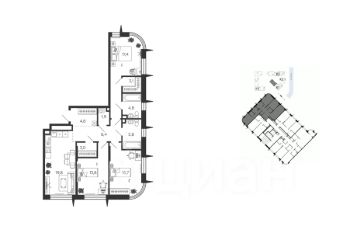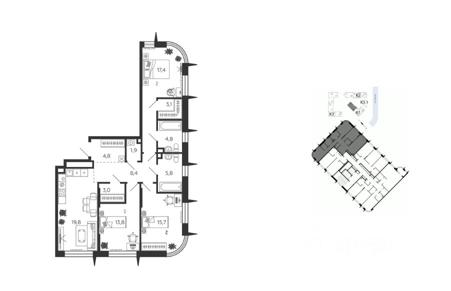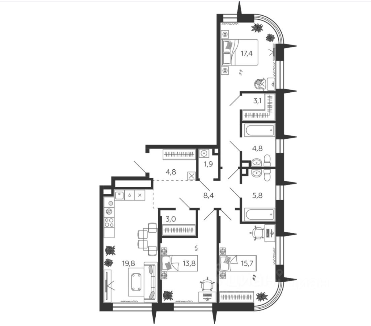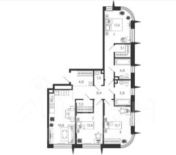 Просторная квартира свободной планировки (без отделки) общей площадью 98,5 кв. м на 3-м этаже. Просторная кухня-гостиная 19,8 кв. м — отличное пространство для реализации дизайнерских решений. Главное преимущество — панорамный вид на воду.