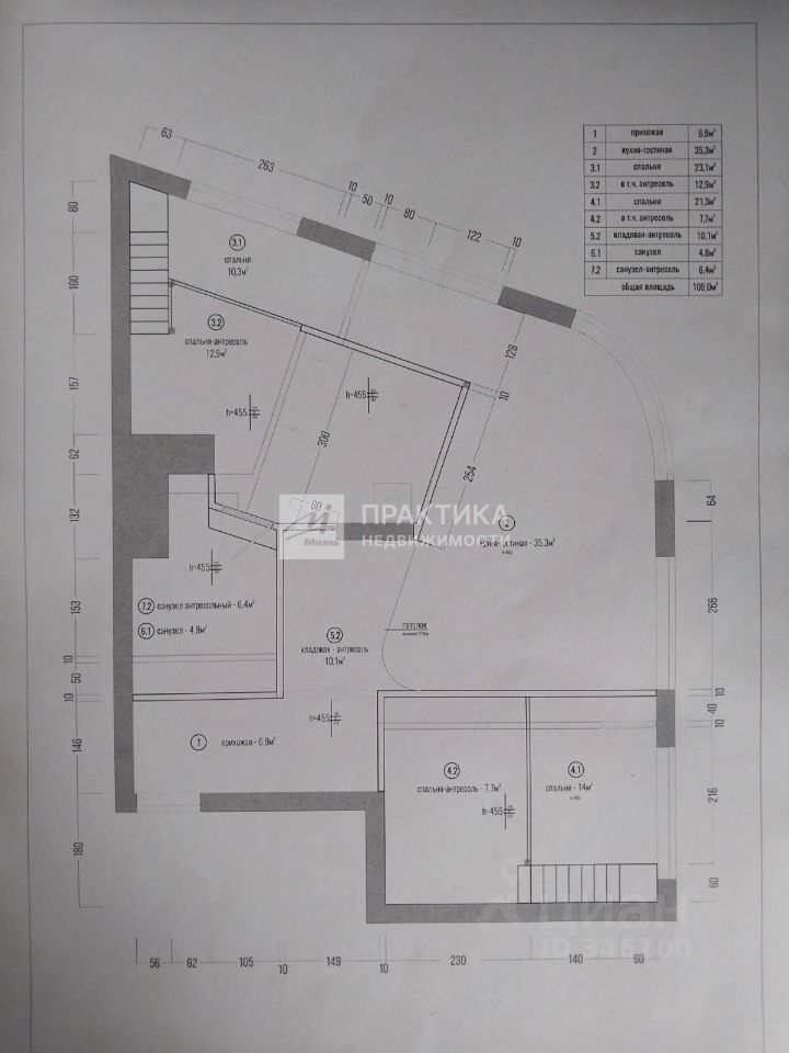 Квартира площадью 109 м2, в том числе первый уровень 72м2, второй жилой 28 м2. что позволяет реализовать: кухню-гостиную со вторым светом площадью 35м2, две спальни (14м2+10,3м2) на первом этаже и две спальни-антресоли (12,9м2+7,7м2) на втором этаже с выделенными гардеробными и рабочими зонами, два санузла (на первом этаже и антресольный), кладовка под потолком над прихожей размером 10м2. (высота 165-175 см.).