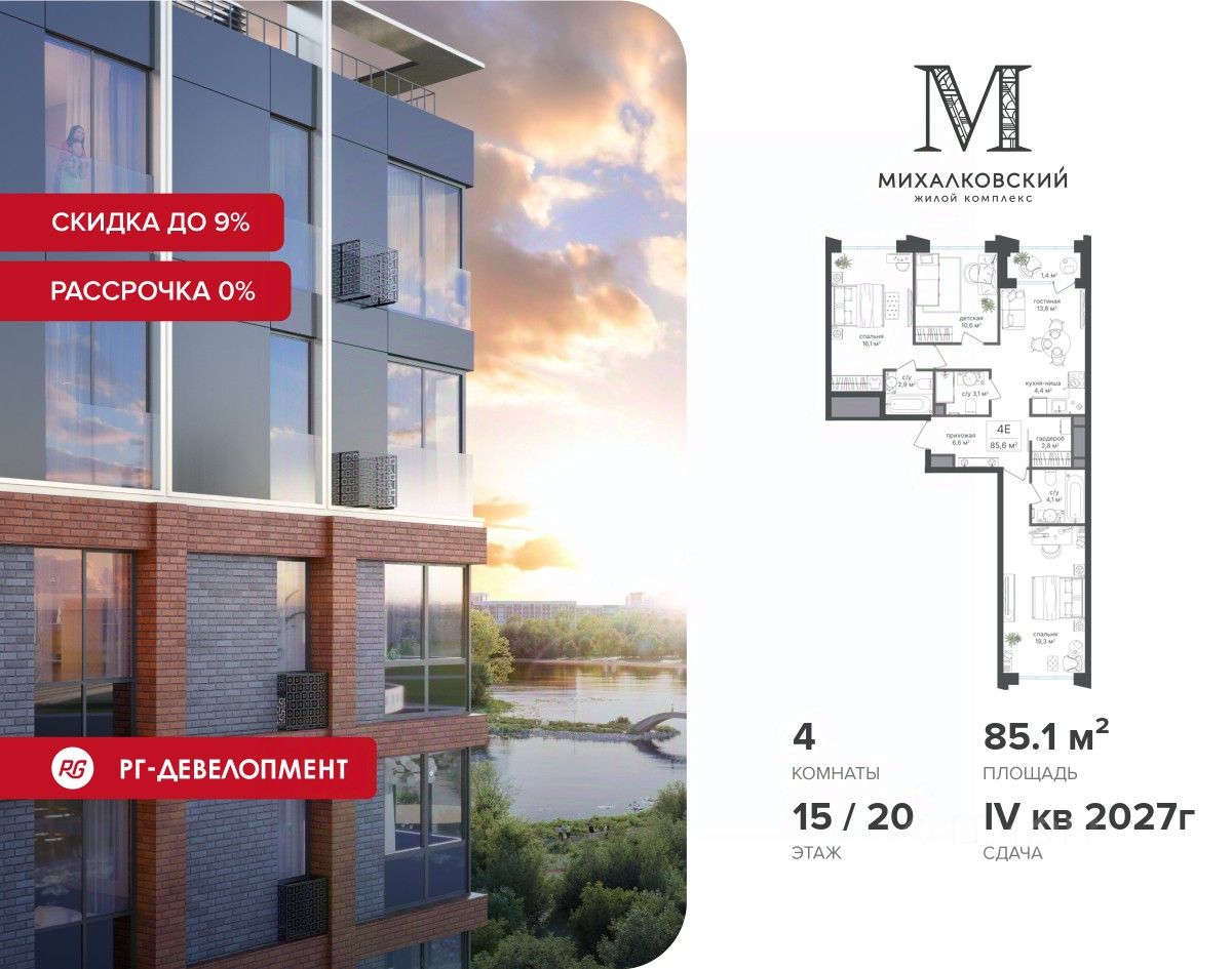 Продаётся 4-к квартира 85,1 кв.м. в ЖК "Михалковский" на 15-м этаже 20 этажного дома.