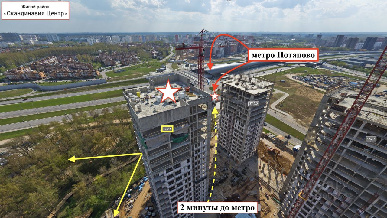 В 280 метрах от дома - большой, всегда свободный и бесплатный паркинг, одного из лучших Гипермаркетов в стране ГЛОБУС. На площадке перед метро Потапово планируется строительство современного ТПУ и ТЦ. В локации - максимально развита коммерческая и социальная инфраструктура, есть абсолютно все.