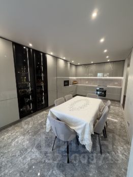 Большое количество места для хранения. Оборудована всей необходимой мебелью и встроенной техникой, европейских брендов: три встроенных холодильника с морозильными камерами, духовой шкаф, электрическая варочная панель, вытяжка, посудомоечная машина, встроенная микроволновая печь. Вся мебель изготовленная на заказ. Фасады кухни из МДФ в эмали;