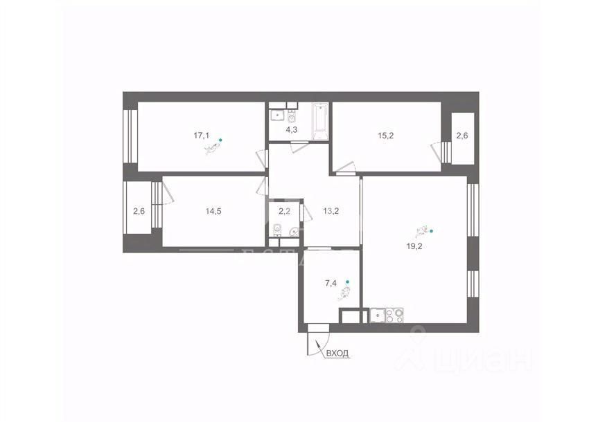 Планировка: просторная кухня-гостиная, три спальни, два совмещенных санузла, прихожая, две лоджии.