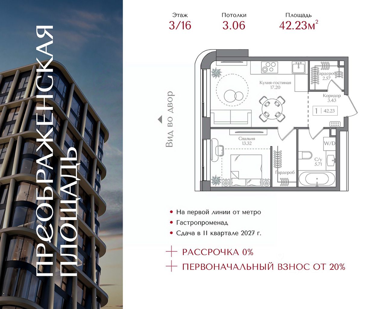 Квартира на 3 этаже в жилом комплексе премиум-класса "Преображенская площадь". Общая площадь: 42.23 кв.м.