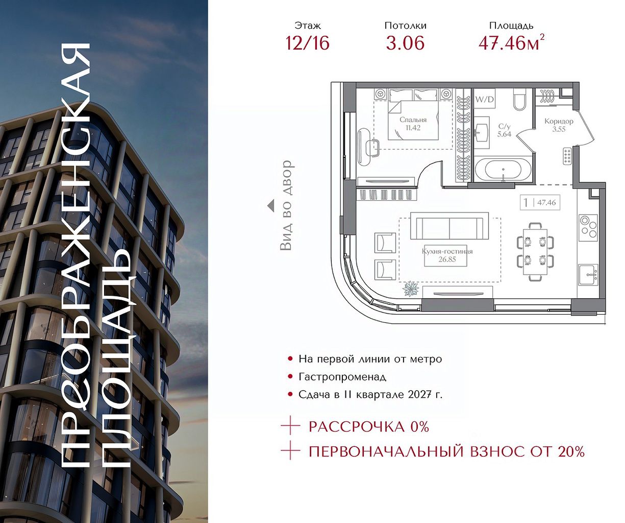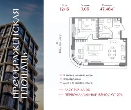 Квартира на 12 этаже в жилом комплексе премиум-класса "Преображенская площадь". Общая площадь: 47.46 кв.м.
