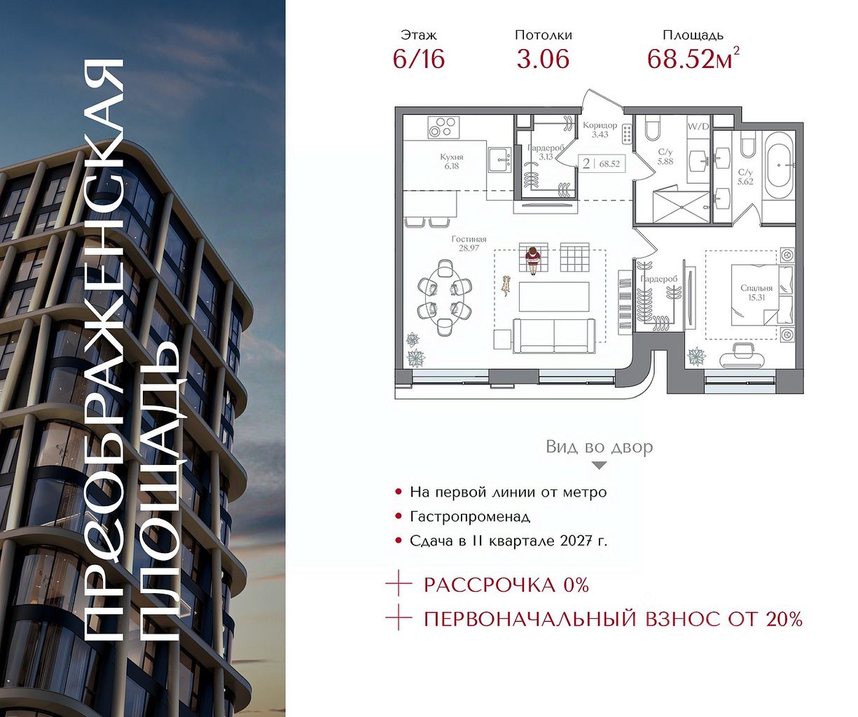 Квартира на 6 этаже в жилом комплексе премиум-класса "Преображенская площадь". Общая площадь: 68.52 кв.м.