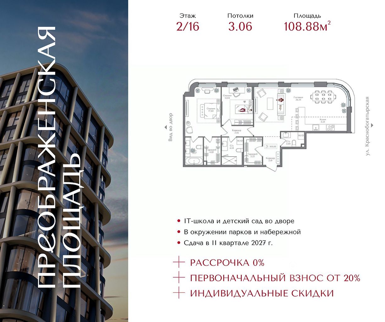 Квартира на 2 этаже в жилом комплексе премиум-класса "Преображенская площадь". Общая площадь: 108.88 кв.м.