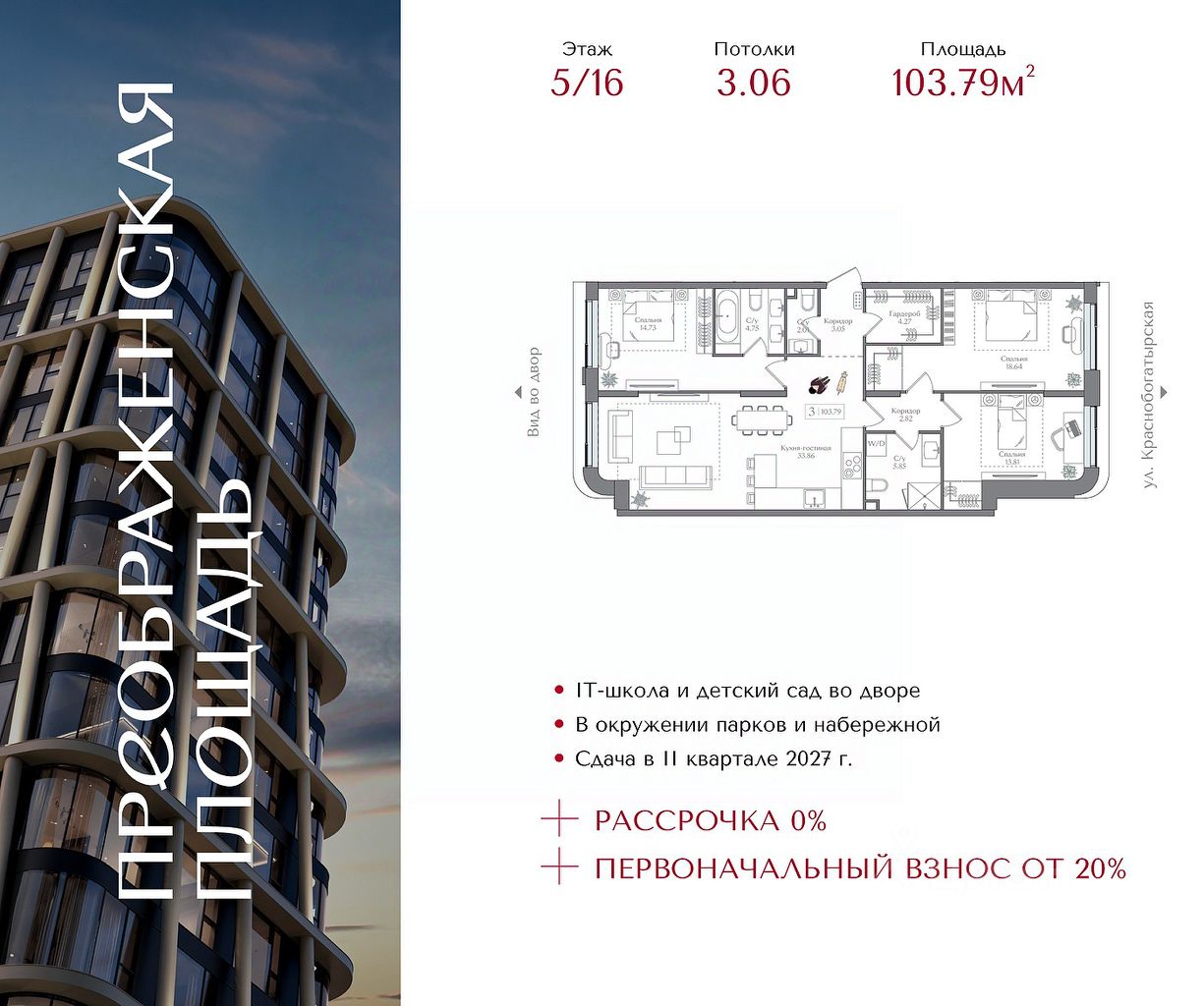 Квартира на 5 этаже в жилом комплексе премиум-класса "Преображенская площадь". Общая площадь: 103.79 кв.м.