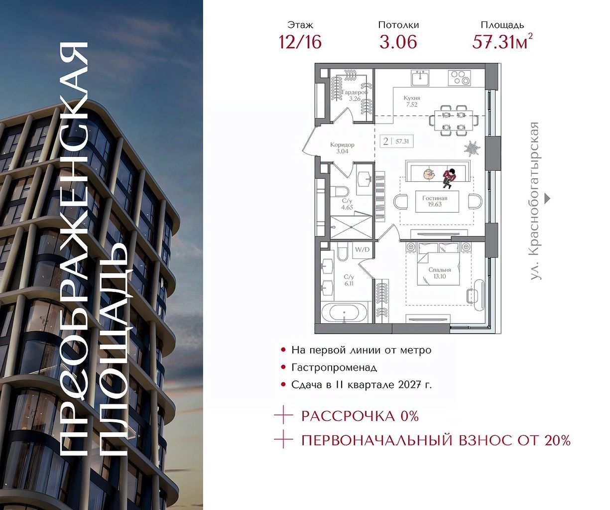 Квартира на 12 этаже в жилом комплексе премиум-класса "Преображенская площадь". Общая площадь: 57.31 кв.м.