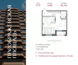 Квартира на 7 этаже в жилом комплексе премиум-класса "Преображенская площадь". Общая площадь: 45.3 кв.м.