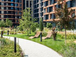 Внутренний двор 1,5 га функциональное и безопасное пространство для игр, работы и занятий спортом. Пешеходный променад для прогулок. Дома переменной этажности. Есть подземный паркинг.