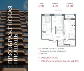 Квартира на 17 этаже в жилом комплексе премиум-класса "Преображенская площадь". Общая площадь: 72.8 кв.м.