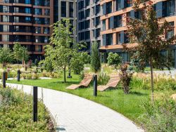 Внутренний двор 1,5 га функциональное и безопасное пространство для игр, работы и занятий спортом. Пешеходный променад для прогулок. Дома переменной этажности. Есть подземный паркинг.