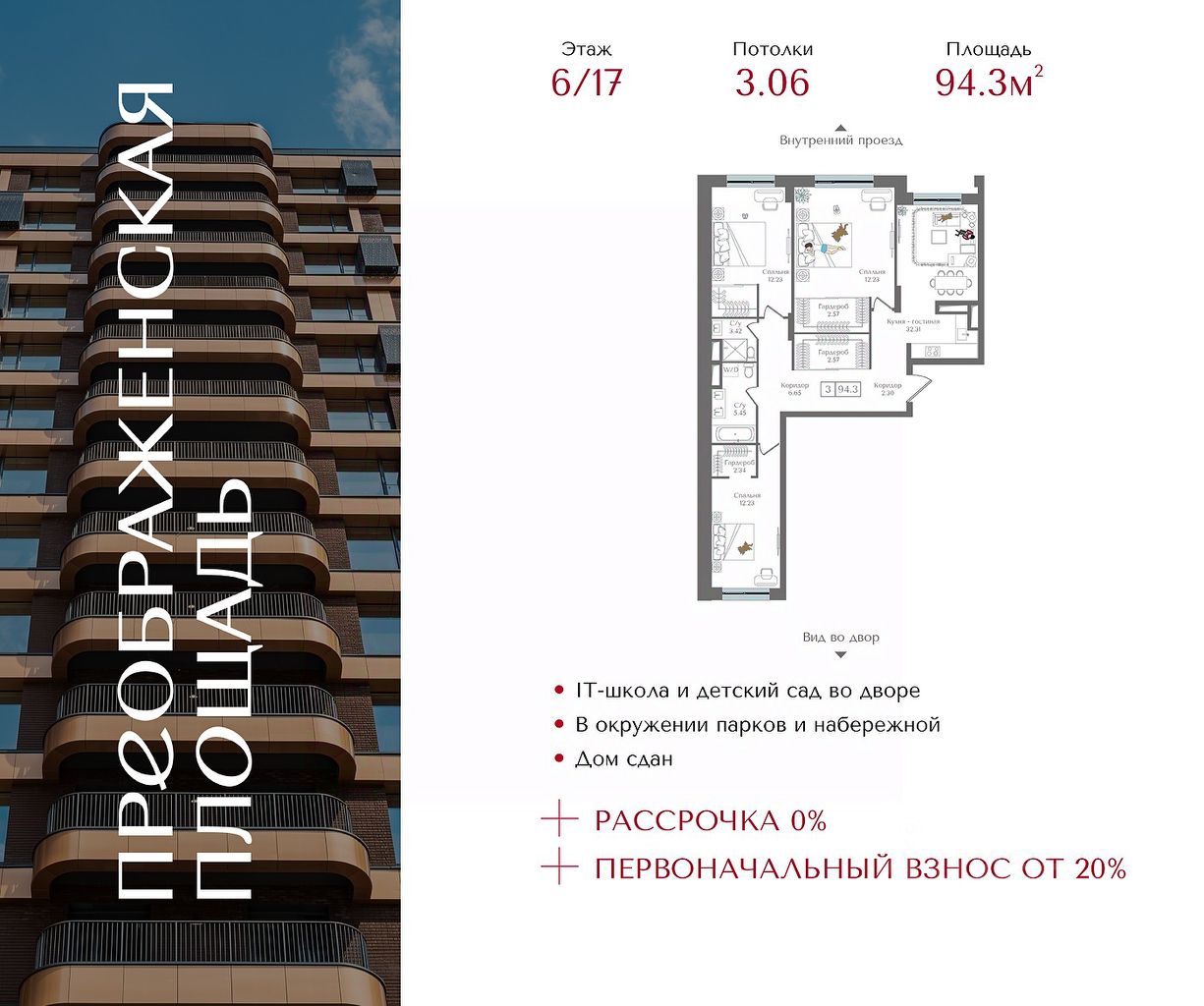 Квартира на 6 этаже в жилом комплексе премиум-класса "Преображенская площадь". Общая площадь: 94.3 кв.м.