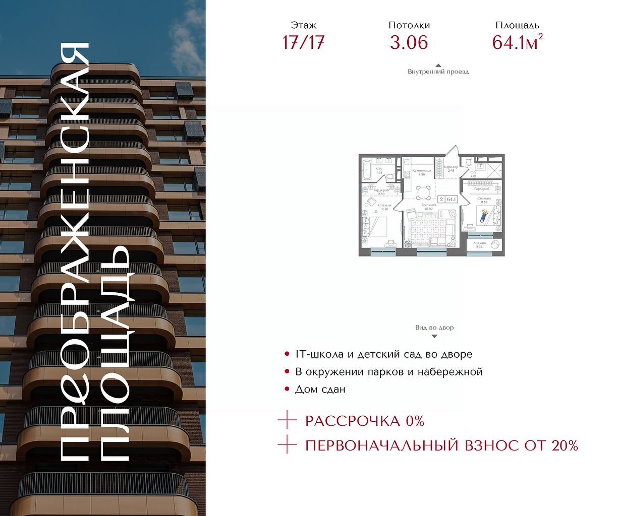 Квартира на 17 этаже в жилом комплексе премиум-класса "Преображенская площадь". Общая площадь: 64.1 кв.м.