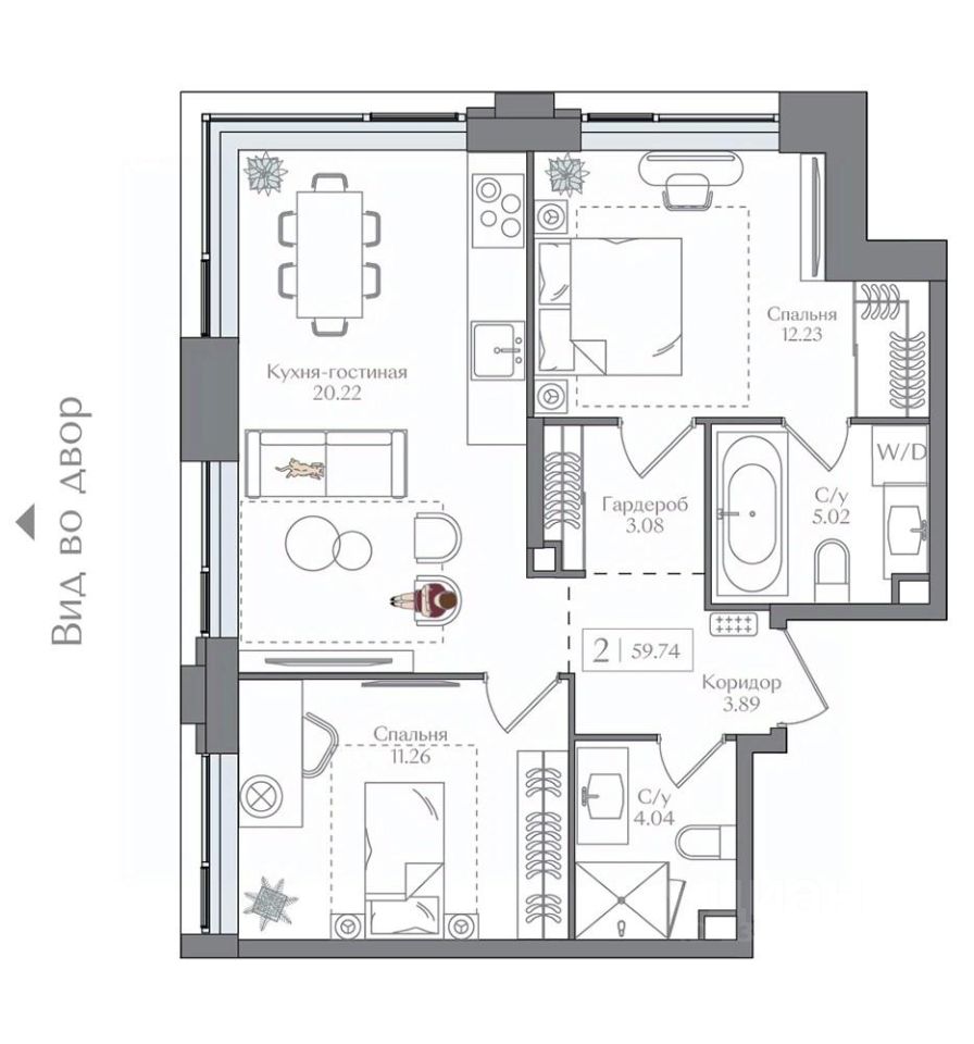 Квартира на 3 этаже в жилом комплексе премиум-класса "Преображенская площадь". Общая площадь: 59.73 кв.м.
