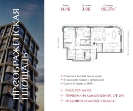 Квартира на 14 этаже в жилом комплексе премиум-класса "Преображенская площадь". Общая площадь: 116.37 кв.м.