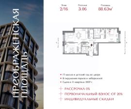 Квартира на 2 этаже в жилом комплексе премиум-класса "Преображенская площадь". Общая площадь: 88.63 кв.м.