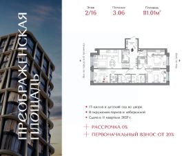 Квартира на 2 этаже в жилом комплексе премиум-класса "Преображенская площадь". Общая площадь: 111.01 кв.м.
