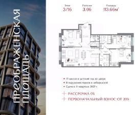 Квартира на 3 этаже в жилом комплексе премиум-класса "Преображенская площадь". Общая площадь: 113.66 кв.м.