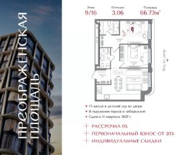 Квартира на 9 этаже в жилом комплексе премиум-класса "Преображенская площадь". Общая площадь: 66.73 кв.м.