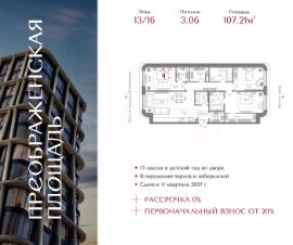 Квартира на 13 этаже в жилом комплексе премиум-класса "Преображенская площадь". Общая площадь: 107.21 кв.м.